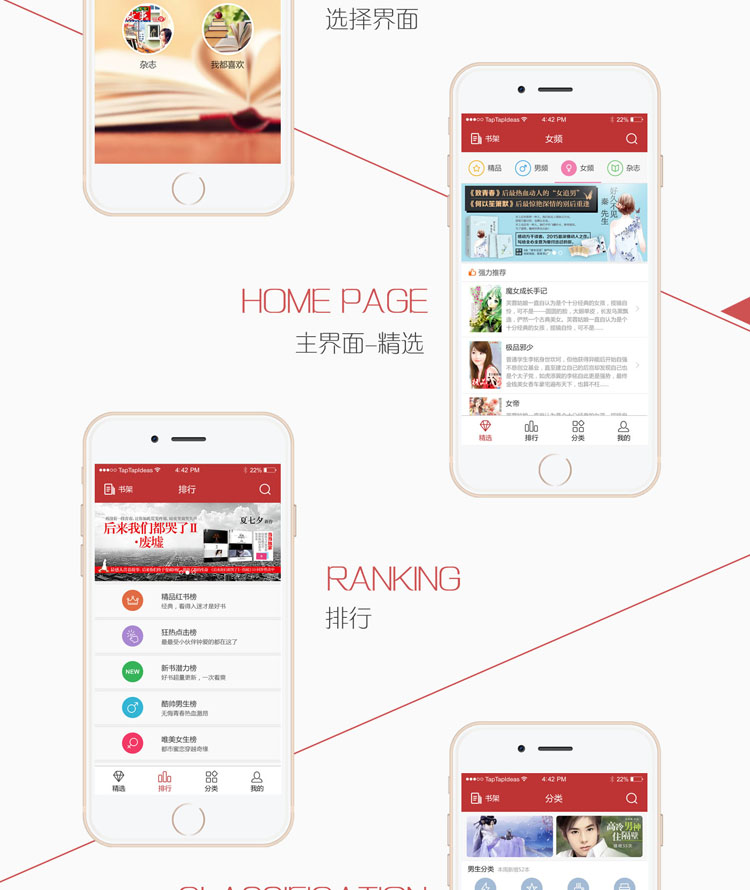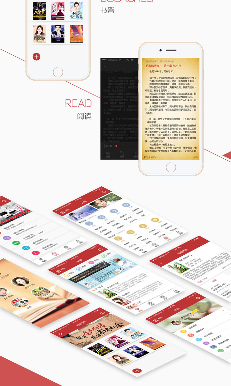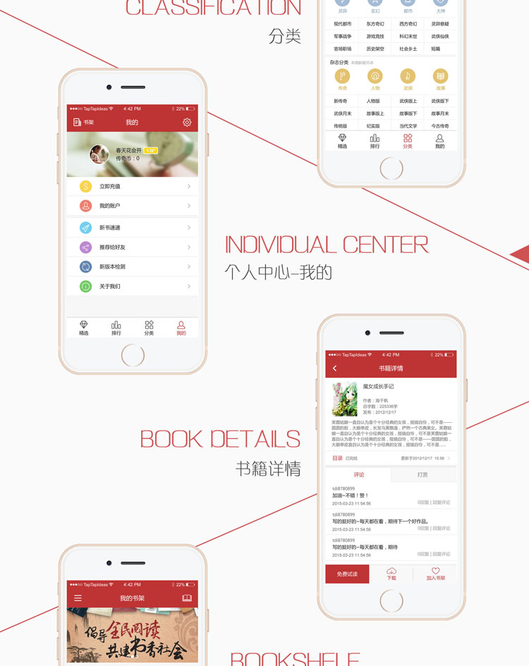 功能:多模式阅读、分类筛书、购买、下载、收藏、跨平台浏览等
