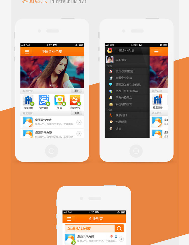 功能:企业展示,信息发布,行业企业推荐,手机导航,一键拨号