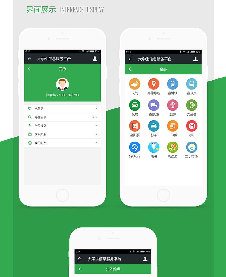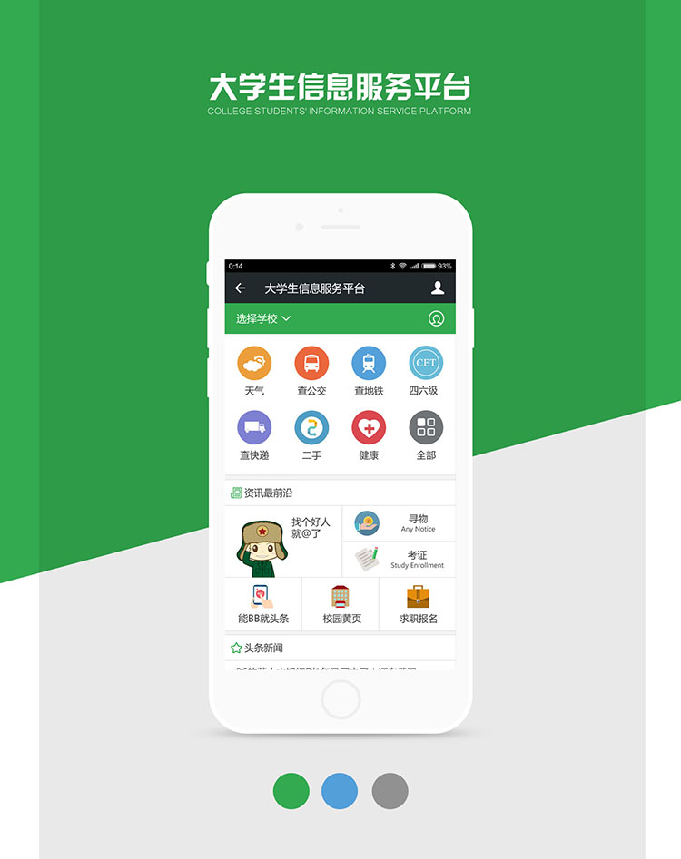 功能:校园资讯关系网络,校园头条互动、求帮忙、寻物启事、学习报名、手机打赏、各类校园服务信息快速检索等