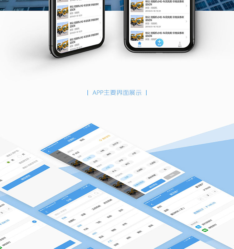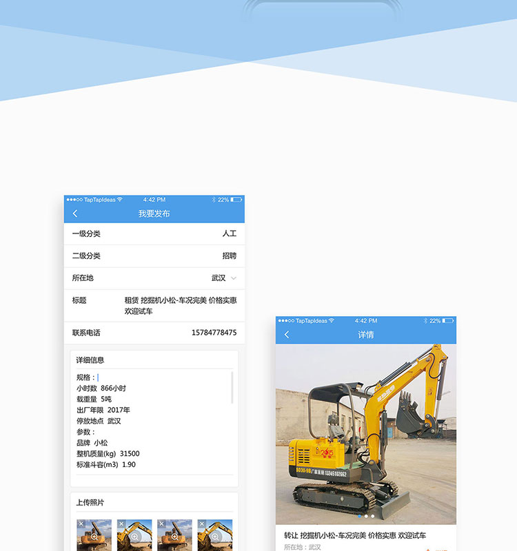 功能:挖机、司机、材料等工程机械行业类信息一应俱全,类似58同城的操作模式,实现专业领域的用户体验升级。